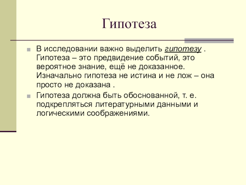 Гипотеза должна быть обоснованной, т. е. подкрепляться литературными данными и логическими соображениями.