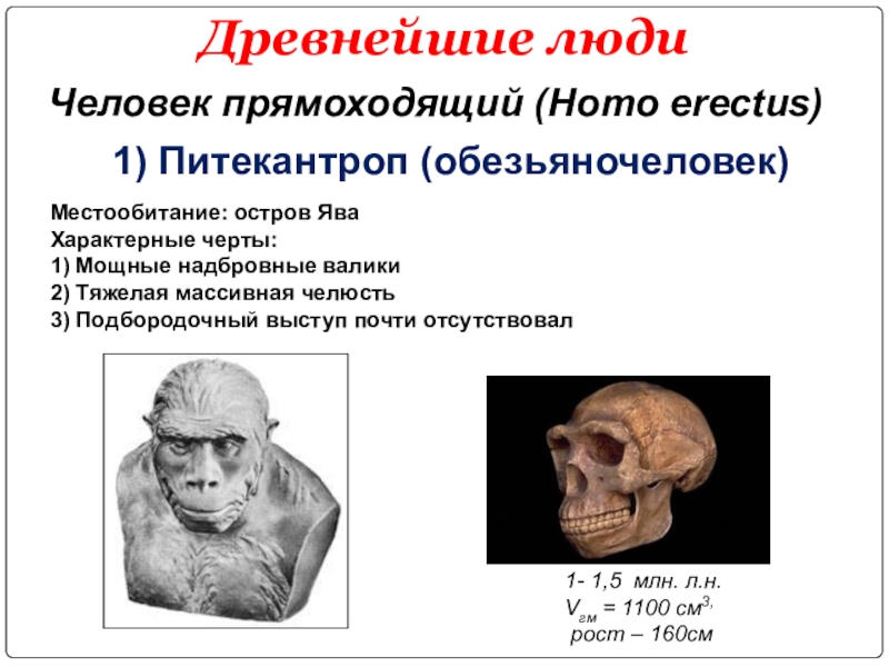 1) Питекантроп (обезьяночеловек)