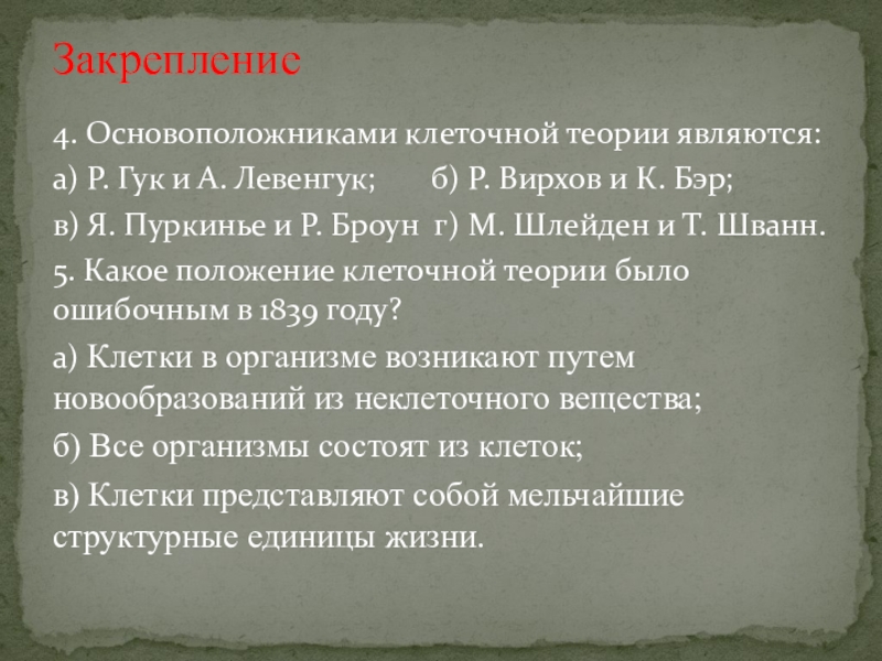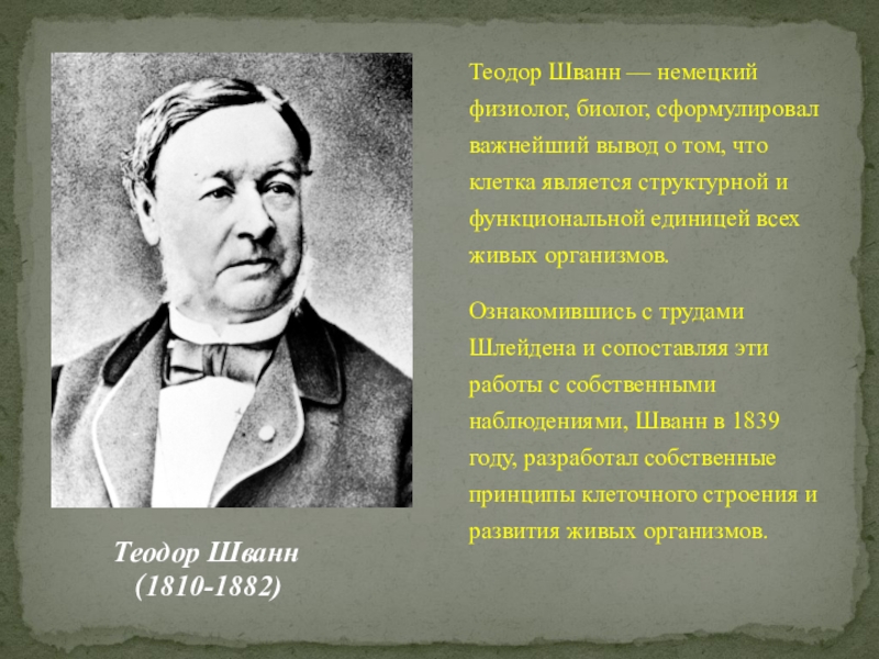 Теодор Шванн — немецкий физиолог, биолог, сформулировал важнейший вывод о том, что клетка является структурной и функциональной единицей всех живых организмов.