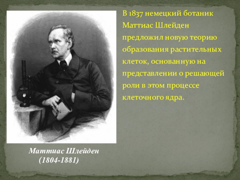 В 1837 немецкий ботаник Маттиас Шлейден предложил новую теорию образования растительных клеток, основанную на представлении о решающей роли в этом процессе клеточного ядра.