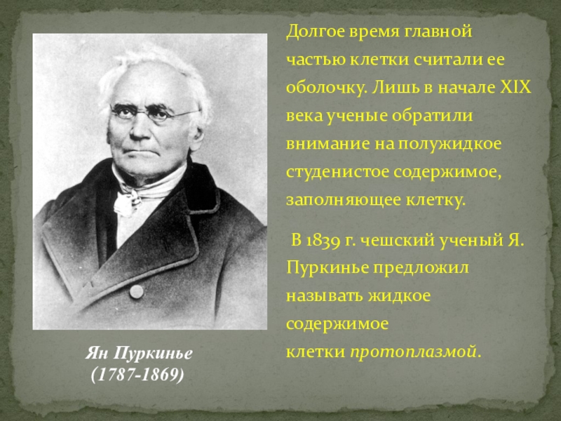 В 1839 г. чешский ученый Я.Пуркинье предложил называть жидкое содержимое клетки протоплазмой.