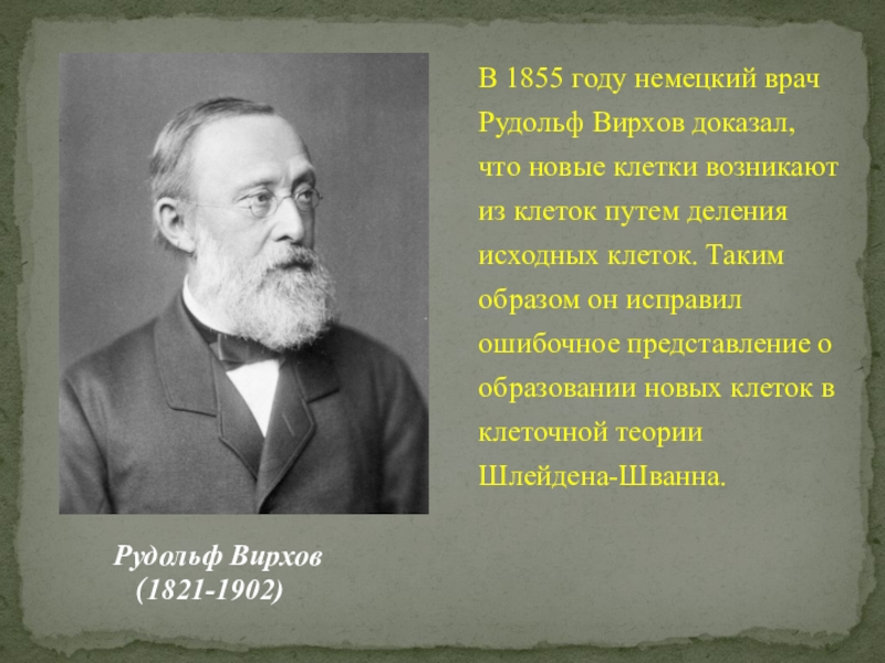 В 1855 году немецкий врач Рудольф Вирхов доказал, что новые клетки возникают из клеток путем деления исходных клеток. Таким образом он исправил ошибочное представление о образовании новых клеток в клеточной теории Шлейдена-Шванна.
