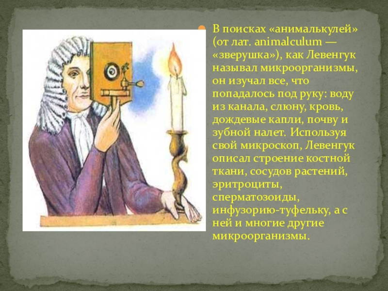 Свое главное открытие — существования микроорганизмов — он сделал в 1676 году, рассмотрев под микроскопом каплю воды.
