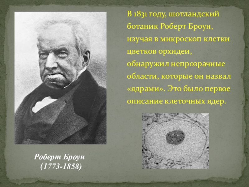 В 1831 году, шотландский ботаник Роберт Броун, изучая в микроскоп клетки цветков орхидеи, обнаружил непрозрачные области, которые он назвал «ядрами». Это было первое описание клеточных ядер.
