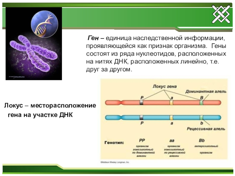 Ген – единица наследственной информации, проявляющейся как признак организма. Гены состоят из ряда нуклеотидов, расположенных на нитях ДНК, расположенных линейно, т.е. друг за другом.