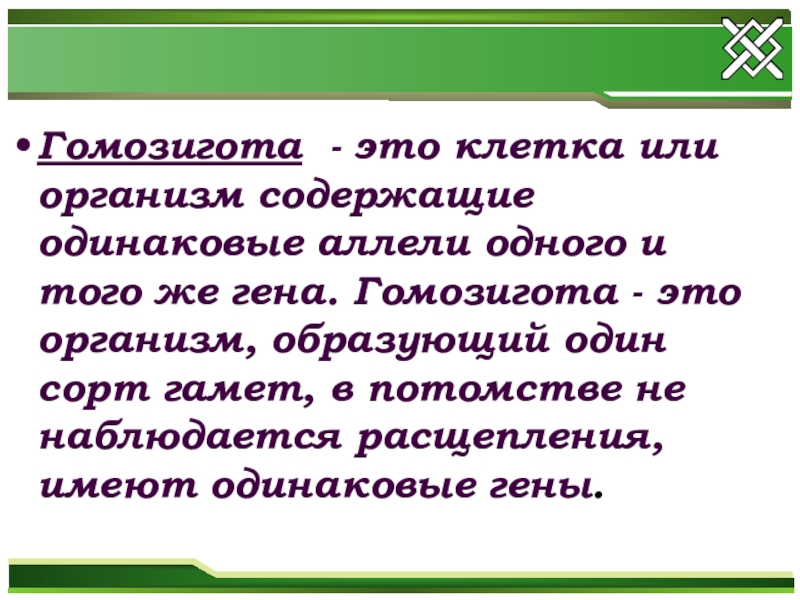 Слайд 18Гомозигота - это клетка или организм содержащие одинаковые аллели одного и