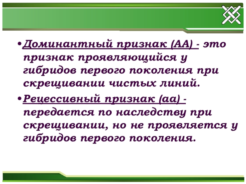 Слайд 15Доминантный признак (АА) - это признак проявляющийся у гибридов первого поколения