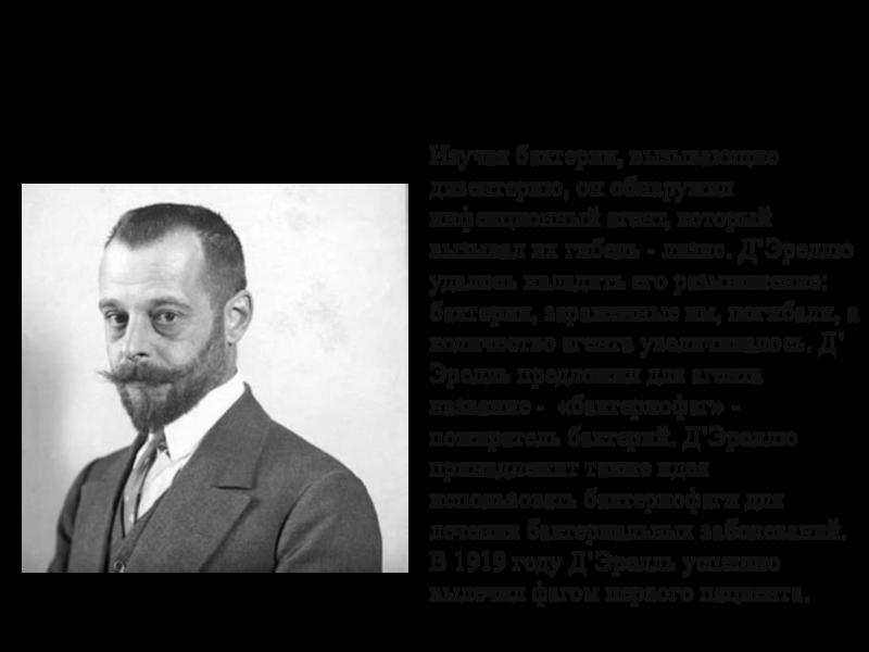 агент, который вызывал их гибель - лизис. Д’Эреллю удалось наладить его размножение: бактерии, зараженные им, погибали, а количество агента увеличивалось. Д’Эрелль предложил для агента название - «бактериофаг» - пожиратель бактерий. Д’Эреллю принадлежит также идея использовать бактериофаги для лечения бактериальных заболеваний. В 1919 году Д’Эрелль успешно вылечил фагом первого пациента.
