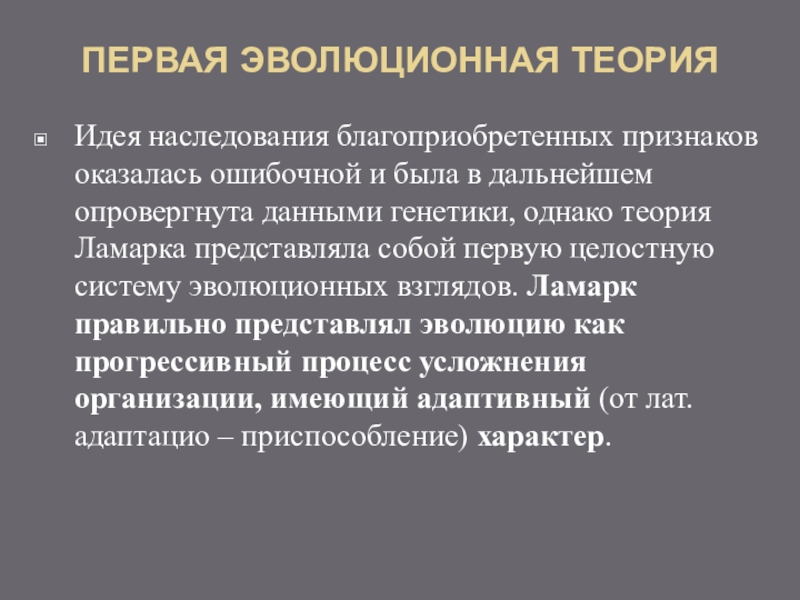 Согласно Ламарку, интенсивно функционирующие органы усиливаются и развиваются, не находящие употребления ослабевают и уменьшаются , а самое главное – эти функционально-морфологические изменения передаются по наследству (наследование благоприобретенных признаков). Само же употребление или неупотребление органов зависит от условий окружающей среды и от присущего любому организму стремления к совершенствованию. Перемена во внешних условиях ведет к изменению потребностей животного, последнее влечёт за собой изменение привычек, далее – усиленное употребление определённых органов.