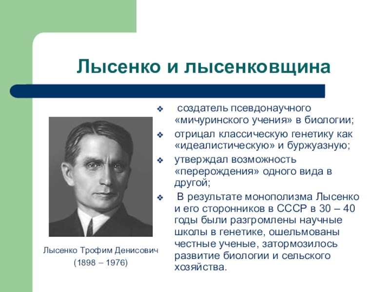 отрицал классическую генетику как «идеалистическую» и буржуазную;