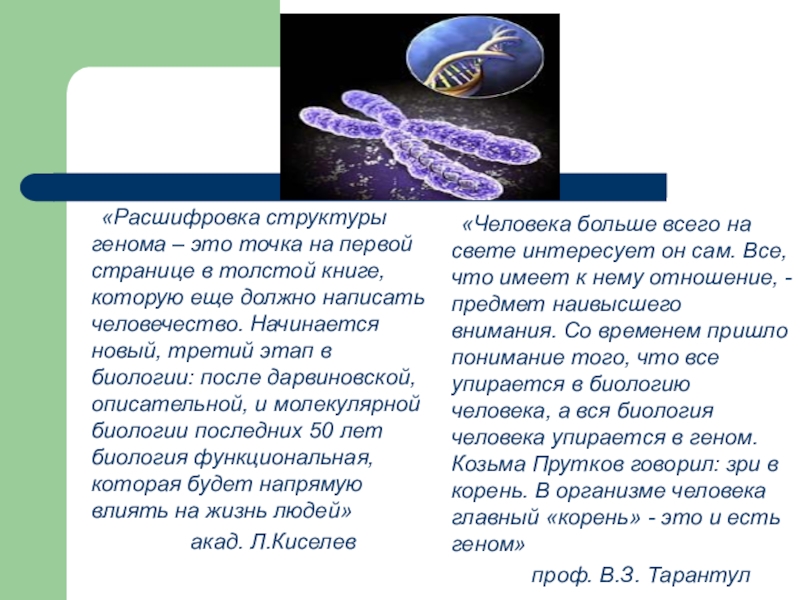 «Человека больше всего на свете интересует он сам. Все, что имеет к нему отношение, - предмет наивысшего внимания. Со временем пришло понимание того, что все упирается в биологию человека, а вся биология человека упирается в геном. Козьма Прутков говорил: зри в корень. В организме человека главный «корень» - это и есть геном»