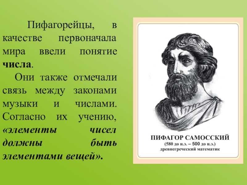 Пифагорейцы, в качестве первоначала мира ввели понятие числа. 	Они также отмечали связь между законами музыки и