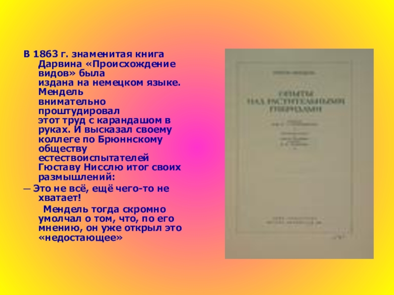 этот труд с карандашом в руках. И высказал своему коллеге по Брюннскому обществу естествоиспытателей Гюставу Нисслю итог своих размышлений: