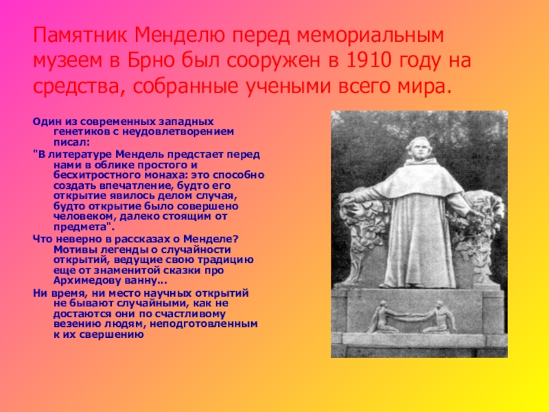 Слайд 18Памятник Менделю перед мемориальным музеем в Брно был сооружен в 1910