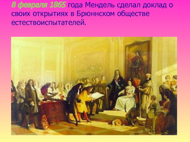 Слайд 138 февраля 1865 года Мендель сделал доклад о своих открытиях в
