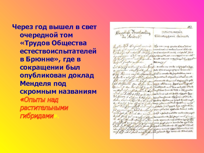 Брюнне», где в сокращении был опубликован доклад Менделя под скромным названиям «Опыты над растительными гибридами».
