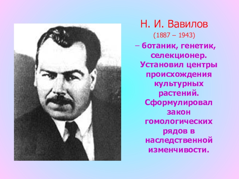 происхождения культурных растений. Сформулировал закон гомологических рядов в наследственной изменчивости.