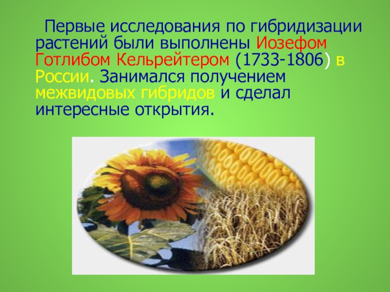 Готлибом Кельрейтером (1733-1806) в России. Занимался получением межвидовых гибридов и сделал интересные открытия.
