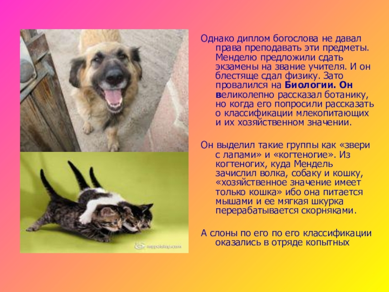 Он выделил такие группы как «звери с лапами» и «когтеногие». Из когтеногих, куда Мендель зачислил волка, собаку и кошку, «хозяйственное значение имеет только кошка» ибо она питается мышами и ее мягкая шкурка перерабатывается скорняками.