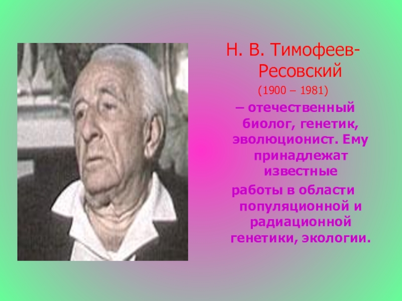– генетика популяций. Сформулировал основные положения популяционной генетики. Исследовал изменчивость в природных популяциях.