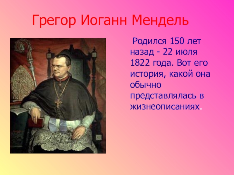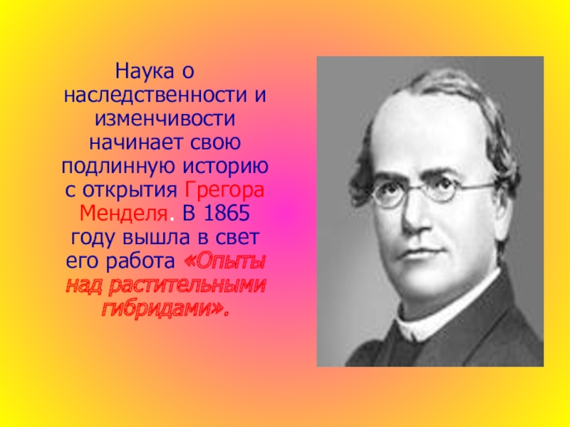 Грегора Менделя. В 1865 году вышла в свет его работа «Опыты над растительными гибридами».