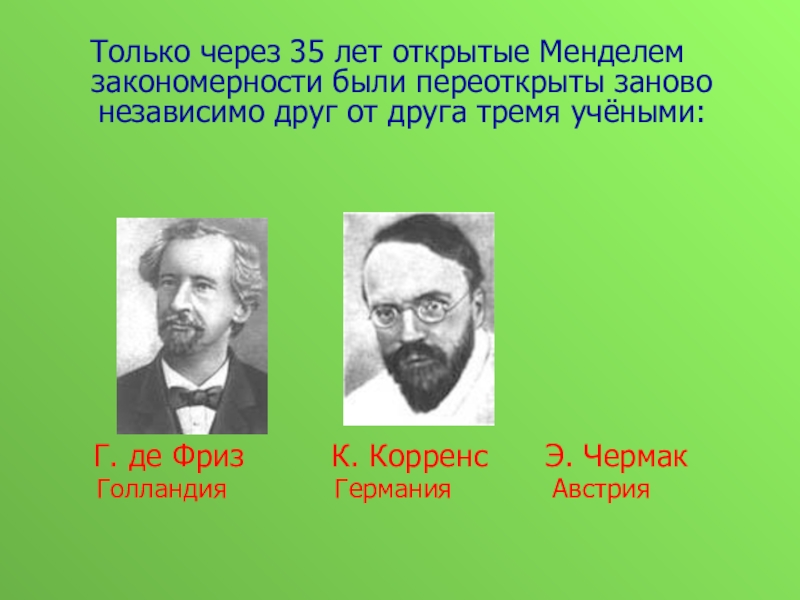 Слайд 19Только через 35 лет открытые Менделем закономерности были переоткрыты заново независимо