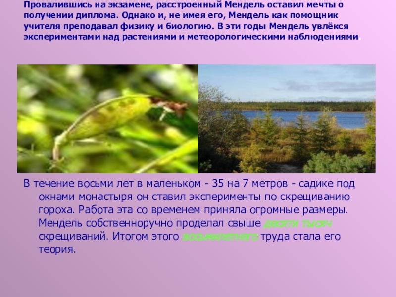 Слайд 11Провалившись на экзамене, расстроенный Мендель оставил мечты о получении диплома. Однако