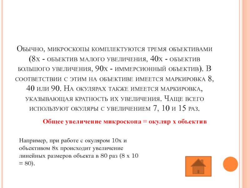 Слайд 12Обычно, микроскопы комплектуются тремя объективами (8х - объектив малого увеличения, 40х