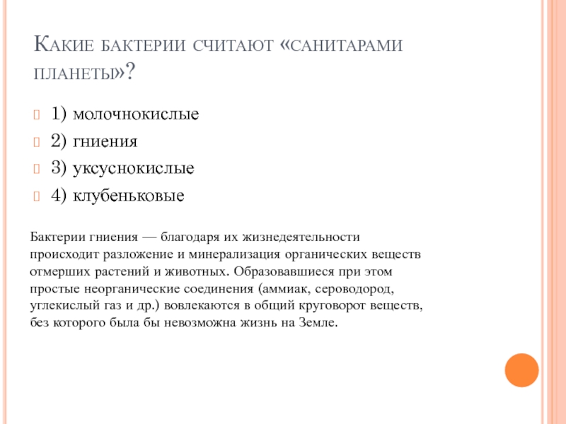 Слайд 41Какие бактерии считают «санитарами планеты»?