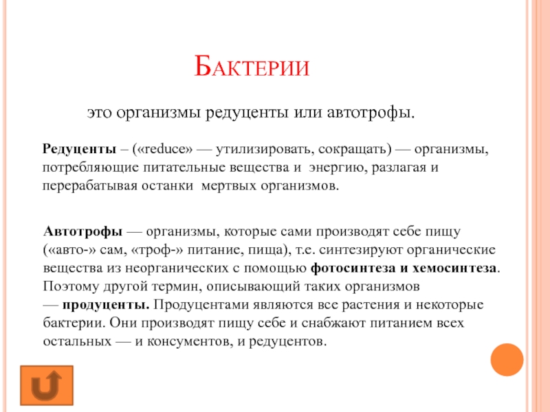 Редуценты – («reduce» — утилизировать, сокращать) — организмы, потребляющие питательные вещества