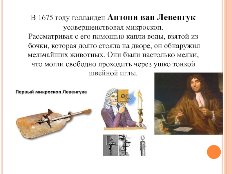 Слайд 10В 1675 году голландец Антони ван Левенгук усовершенствовал микроскоп.