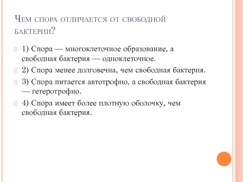 3) Спора питается автотрофно, а свободная бактерия — гетеротрофно.