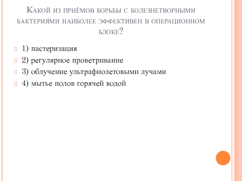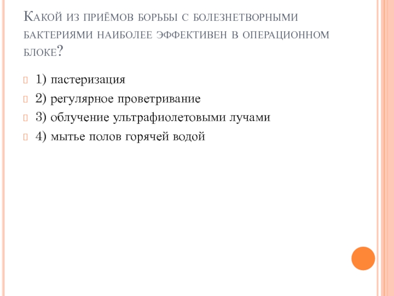 Слайд 38Какой из приёмов борьбы с болезнетворными бактериями наиболее эффективен в операционном