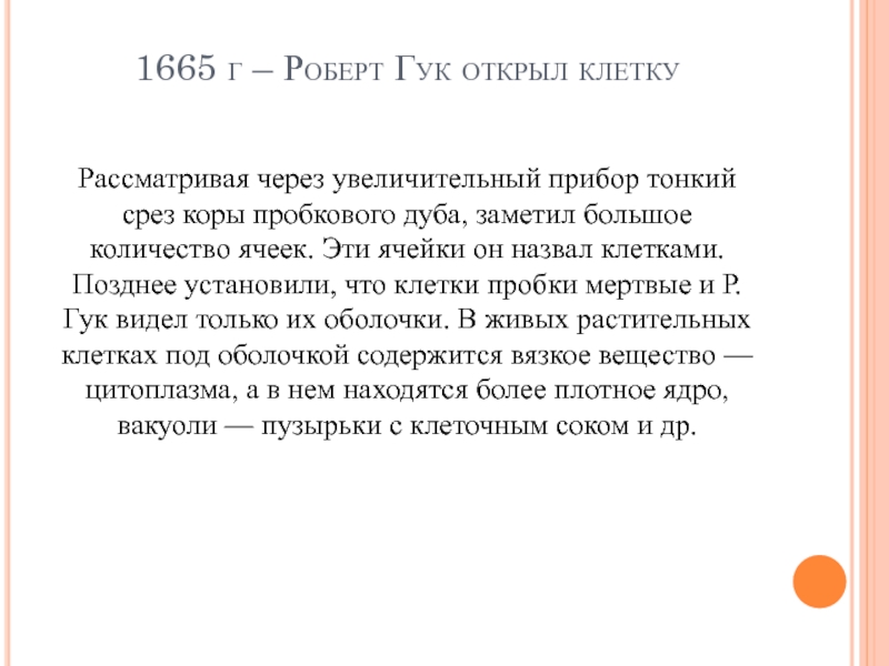 срез коры пробкового дуба, заметил большое количество ячеек. Эти ячейки он назвал клетками. Позднее установили, что клетки пробки мертвые и Р. Гук видел только их оболочки. В живых растительных клетках под оболочкой содержится вязкое вещество — цитоплазма, а в нем находятся более плотное ядро, вакуоли — пузырьки с клеточным соком и др.