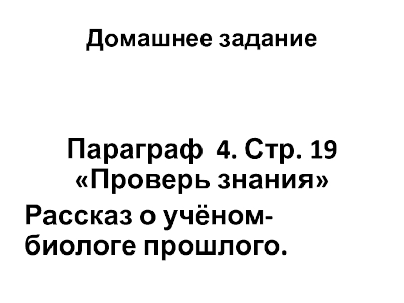 Домашнее заданиеПараграф 4. Стр. 19 «Проверь знания»Рассказ о учёном-биологе прошлого.