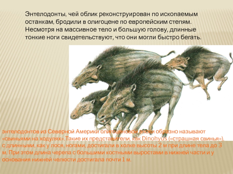 Слайд 14Энтелодонты, чей облик реконструирован по ископаемым останкам, бродили в олигоцене по