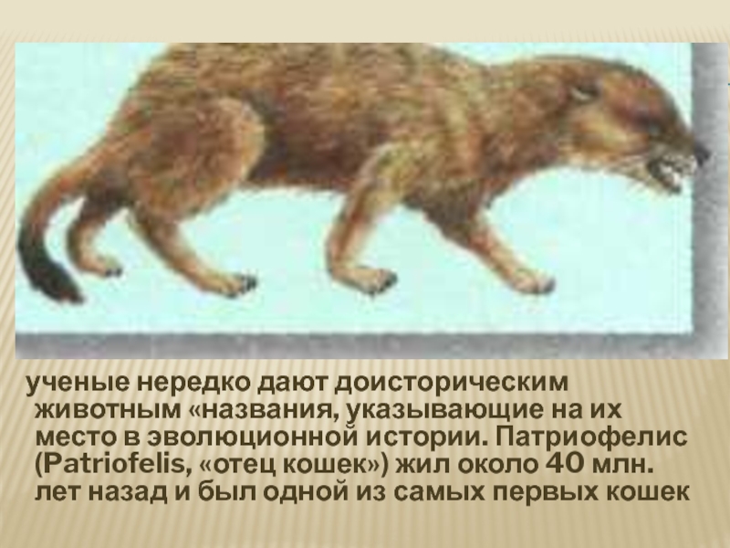 место в эволюционной истории. Патриофелис (Patriofelis, «отец кошек») жил около 40 млн. лет назад и был одной из самых первых кошек