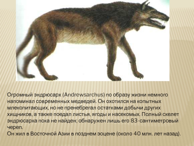 Слайд 18Огромный эндрюсарх (Andrewsarchus) по образу жизни немного напоминал современных медведей. Он