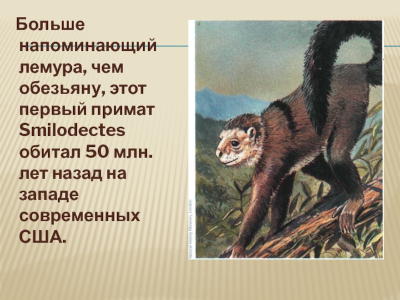 Слайд 29 Больше напоминающий лемура, чем обезьяну, этот первый примат Smilodectes