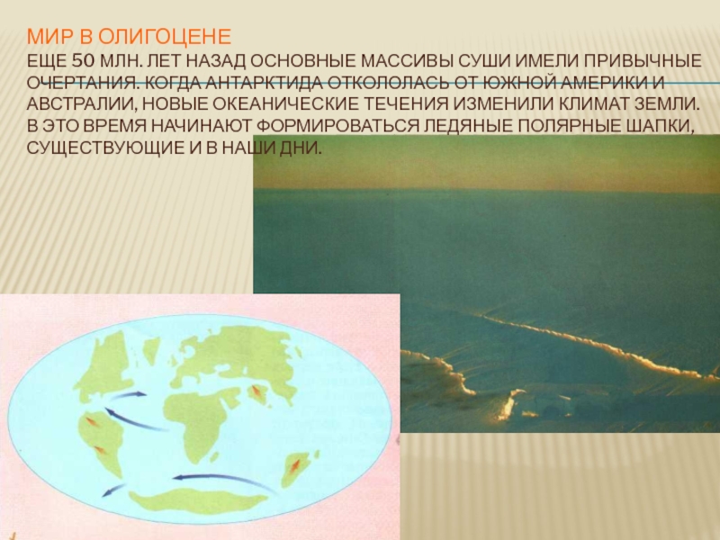 привычные очертания. Когда Антарктида откололась от Южной Америки и Австралии, новые океанические течения изменили климат Земли. В это время начинают формироваться ледяные полярные шапки, существующие и в наши дни.