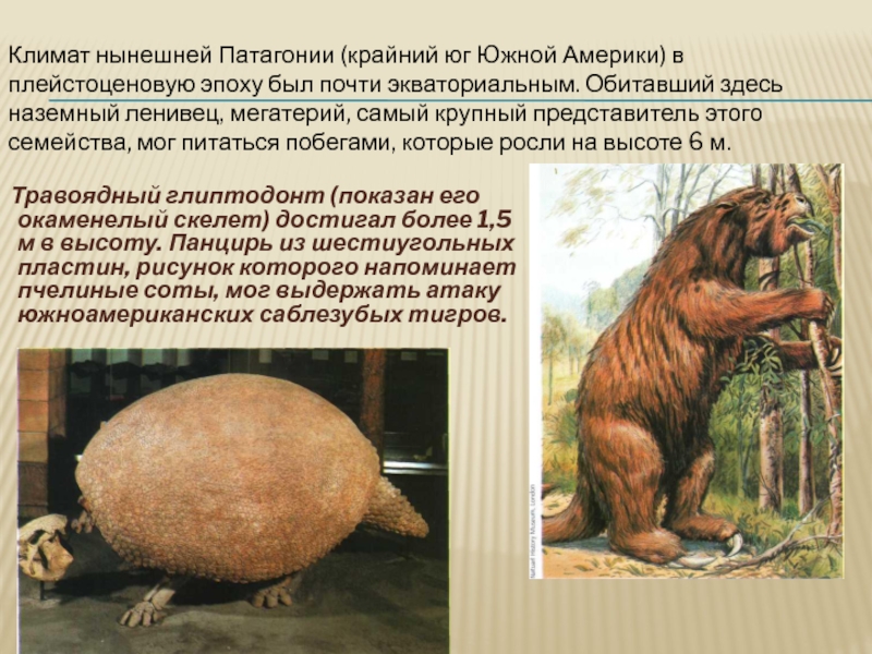 Климат нынешней Патагонии (крайний юг Южной Америки) в плейстоценовую эпоху был почти экваториальным. Обитавший здесь наземный ленивец, мегатерий, самый крупный представитель этого семейства, мог питаться побегами, которые росли на высоте 6 м.