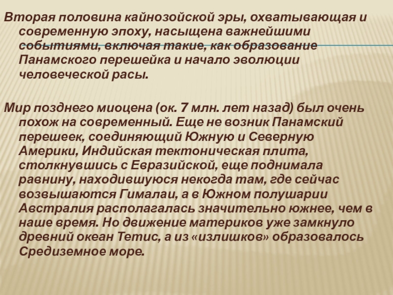 Слайд 30Вторая половина кайнозойской эры, охватывающая и современную эпоху, насыщена важнейшими событиями,