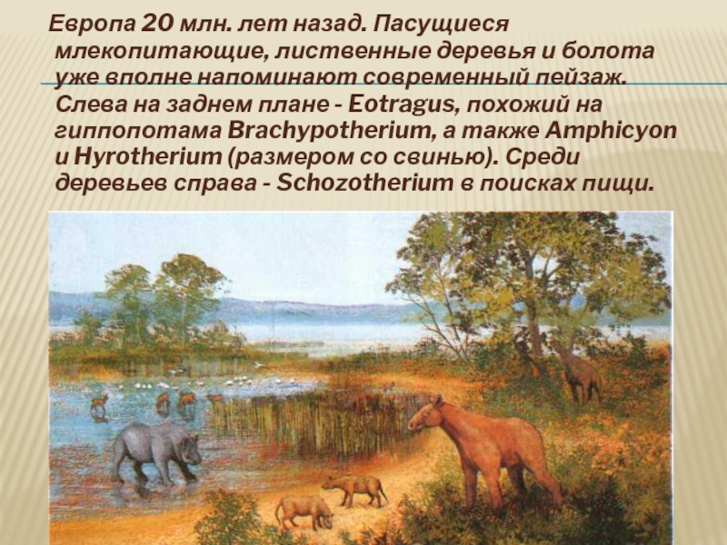 Слайд 32 Европа 20 млн. лет назад. Пасущиеся млекопитающие, лиственные деревья