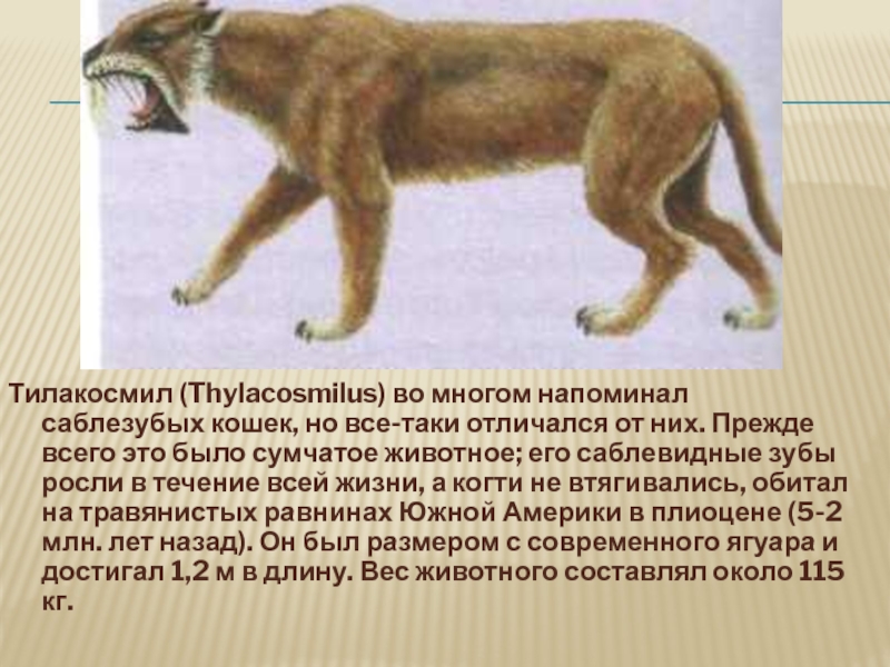 Слайд 19Тилакосмил (Thylacosmilus) во многом напоминал саблезубых кошек, но все-таки отличался от