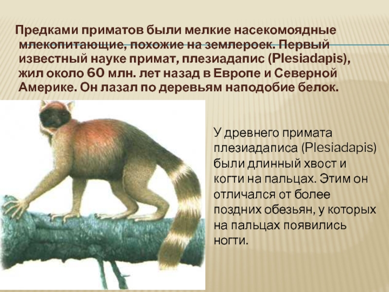 У древнего примата плезиадаписа (Plesiadapis) были длинный хвост и когти на пальцах. Этим он отличался от более поздних обезьян, у которых на пальцах появились ногти.