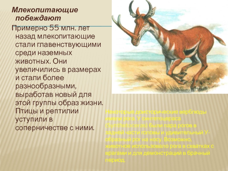 стали главенствующими среди наземных животных. Они увеличились в размерах и стали более разнообразными, выработав новый для этой группы образ жизни. Птицы и рептилии уступили в соперничестве с ними.