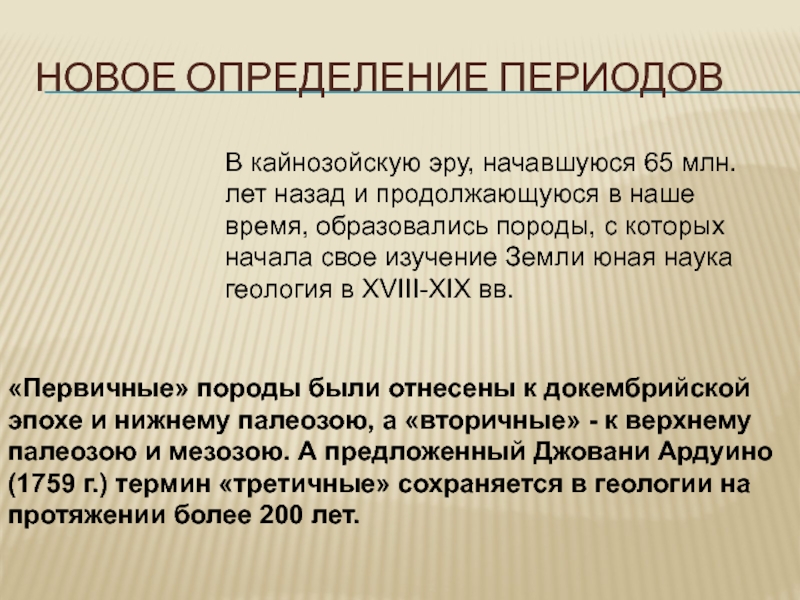 «Первичные» породы были отнесены к докембрийской эпохе и нижнему палеозою, а «вторичные» - к верхнему палеозою и мезозою. А предложенный Джовани Ардуино (1759 г.) термин «третичные» сохраняется в геологии на протяжении более 200 лет.