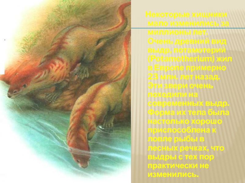 вид выдр, потамотерий (Potamotherium) жил в Европе примерно 23 млн. лет назад. Эти звери очень походили на современных выдр. Форма их тела была настолько хорошо приспособлена к ловле рыбы в лесных речках, что выдры с тех пор практически не изменились.