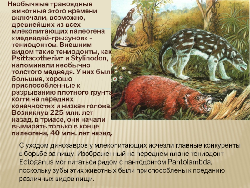 С уходом динозавров у млекопитающих исчезли главные конкуренты в борьбе за пищу. Изображенный на переднем плане тениодонт Ectoganus мог питаться рядом с пантодонтом Pantolambda, поскольку зубы этих животных были приспособлены к поеданию различных видов пищи.