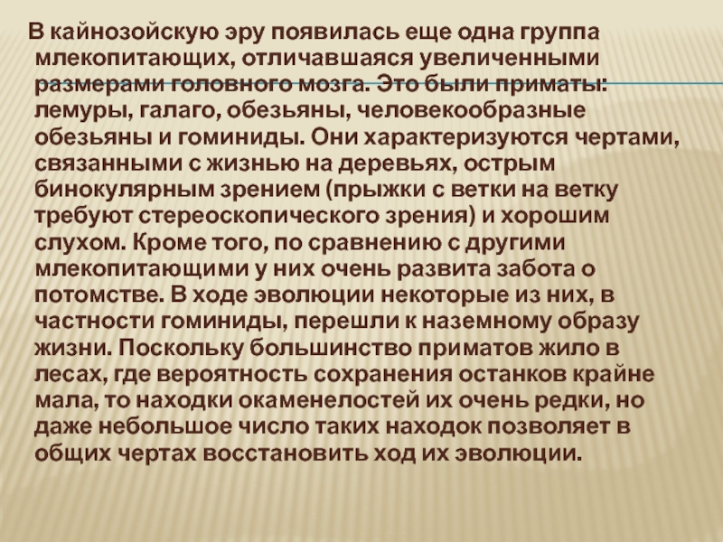 увеличенными размерами головного мозга. Это были приматы: лемуры, галаго, обезьяны, человекообразные обезьяны и гоминиды. Они характеризуются чертами, связанными с жизнью на деревьях, острым бинокулярным зрением (прыжки с ветки на ветку требуют стереоскопического зрения) и хорошим слухом. Кроме того, по сравнению с другими млекопитающими у них очень развита забота о потомстве. В ходе эволюции некоторые из них, в частности гоминиды, перешли к наземному образу жизни. Поскольку большинство приматов жило в лесах, где вероятность сохранения останков крайне мала, то находки окаменелостей их очень редки, но даже небольшое число таких находок позволяет в общих чертах восстановить ход их эволюции.